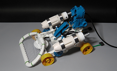水中なのでもともと滑るのでスキップパッドのようなモノでも良いですし、本来はそのまま浮きながら現場まで走行させても良いのですが、確実に目的地まで行くのには車輪がある方がまっすぐ進みます。このメカに舵は無いので左右のポンプのオンオフで方向を変えます。タイヤがあるので地上ではこんなことは出来ませんが、水中だからこそ出来るいい加減な方法というのもあって、余計な機構を付けなくてもどうにかなるという曖昧な操縦方法で成り立っています。
