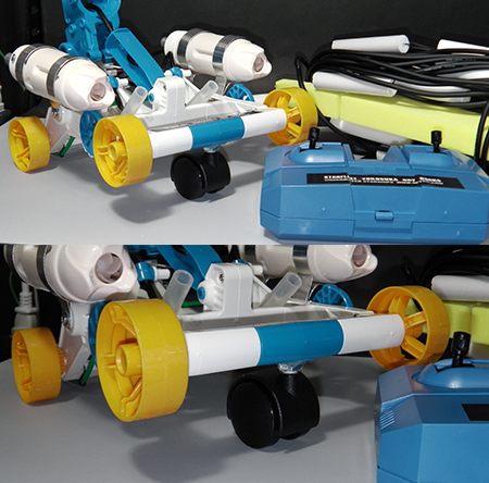 確実性が要求されるレスキューでそれはどうなのかという疑問もあるでしょうが、そもそも水底を走ること自体が地上と違ってタイヤがしっかりグリップするわけでも無いですし、わざわざにゴムを付けずにプラスチックだけの滑りまくるタイヤを付けているわけで、曖昧な操縦方法と、走行性能に助けられていると言うことです。それでもタイヤが回る方が抵抗がありませんから基本的にまっすぐ進むようになります。